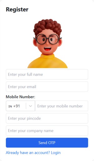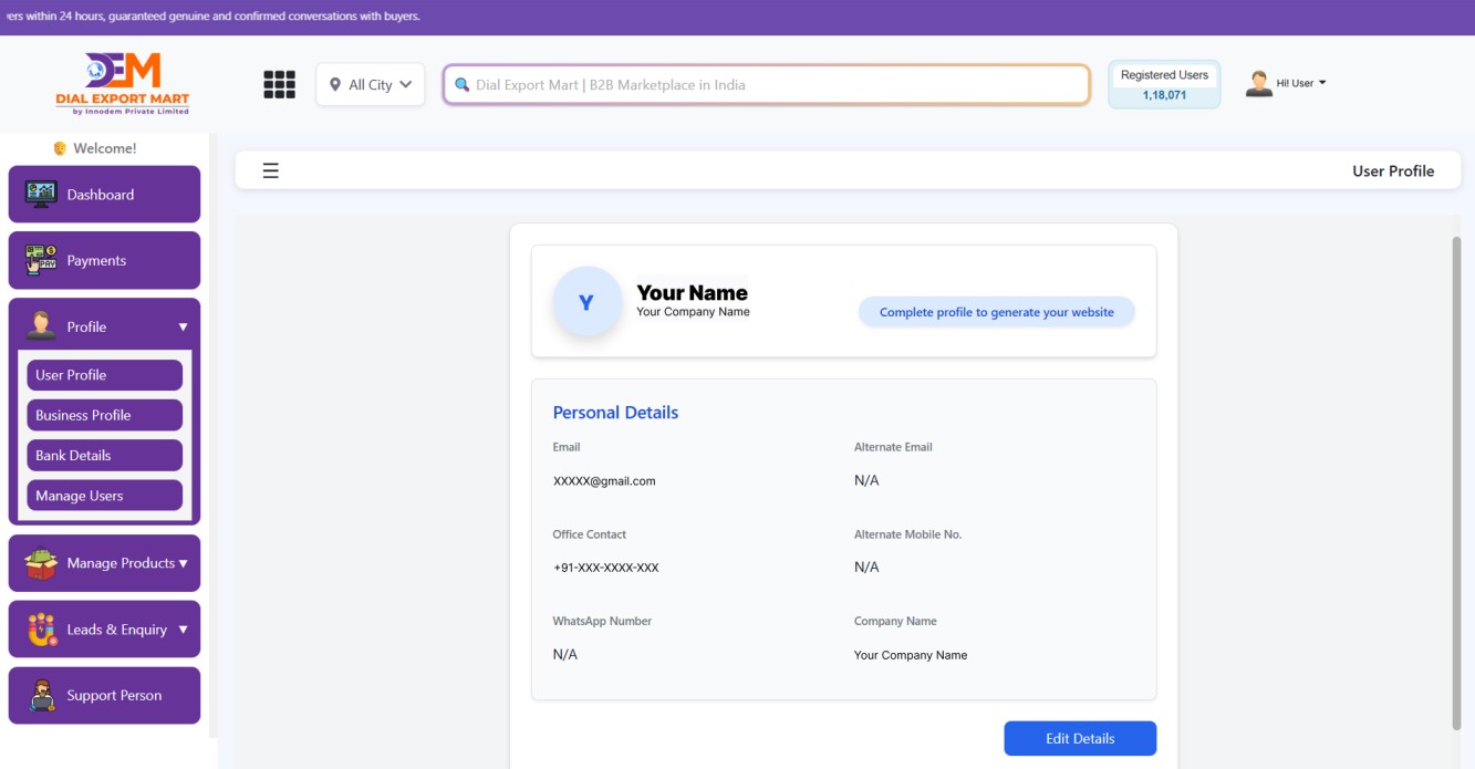 After registration, you’ll be prompted to enter basic user details such as your name, contact number, WhatsApp number, company name, and email. This helps build credibility for your account